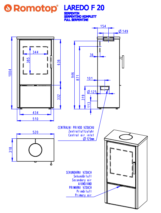 | LAREDO H (akumulace) | ≈ 1312–1320 × 528 × 398 mm | ≈ 126–142 kg | akumulační prstence nad topeništěm |