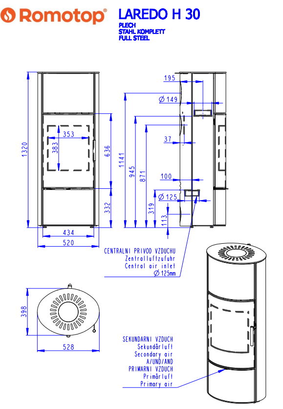 | LAREDO H (akumulace) | ≈ 1312–1320 × 528 × 398 mm | ≈ 126–142 kg | akumulační prstence nad topeništěm |
