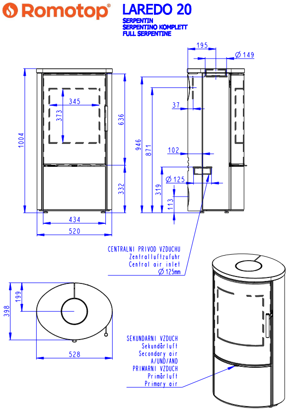 | LAREDO H (akumulace) | ≈ 1312–1320 × 528 × 398 mm | ≈ 126–142 kg | akumulační prstence nad topeništěm |